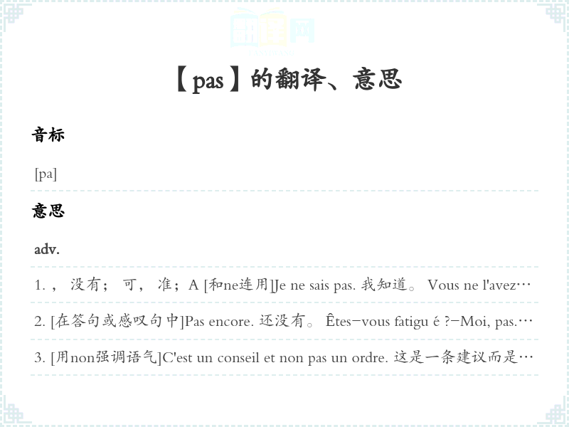 [在答句或感叹句中]Pas encore. 还没有。 Êtes-vous fatigué?-Moi, pas. [Pas moi.] 您了吧?-我。 Pourquoi pas? 什么?Pas d'histoires! <口>别啰唆了!要瞎扯了!pas un 没有一个, 没有一只 Pas un ne le croit. 没有一个人相信。口>