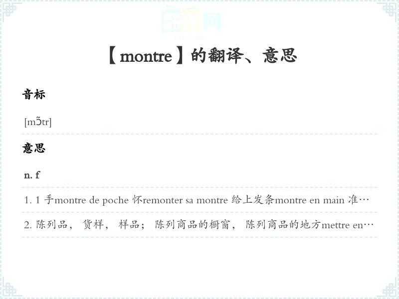 陈列品, 货样, 样品; 陈列商品的橱窗, 陈列商品的地方mettre en montre 陈列objet en montre 陈列品le libraire a mis quelques beaux livres en montre 书店老板陈列了几本装帧漂亮的书籍3<书>显, 现pour la montre 为了装点门面faire montre de son érudition 卖弄学问faire montre de compréhension 解书>