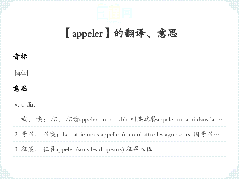取名, 命名; 名On l'appelle Pierre. 们叫他埃尔。 appeler les choses par leur nom 直言不讳appeler noir ce qui est blanc颠倒黑白Il était absent quand on a appelé son nom. 名到他时候, 他不在。 appeler une cause [法](庭讯时)对当事名