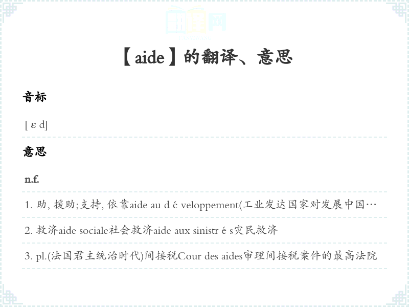 助, 助手, 助理, 副手aide maternelle保育aide ménagère(助照顾老年人生活的)护理人aide de laboratoire实验室助手