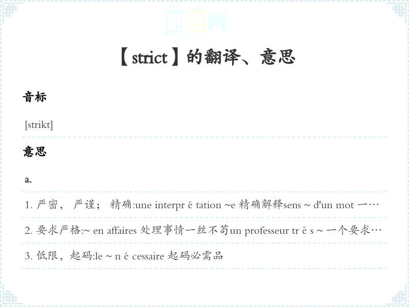 要求严格:~ en affaires 处理事情一丝不苟un professeur très ~ 一个要求严格教师être ~ envers soi 严格要求自己Il est très ~ sur la discipline. 他在纪律上是很严格。