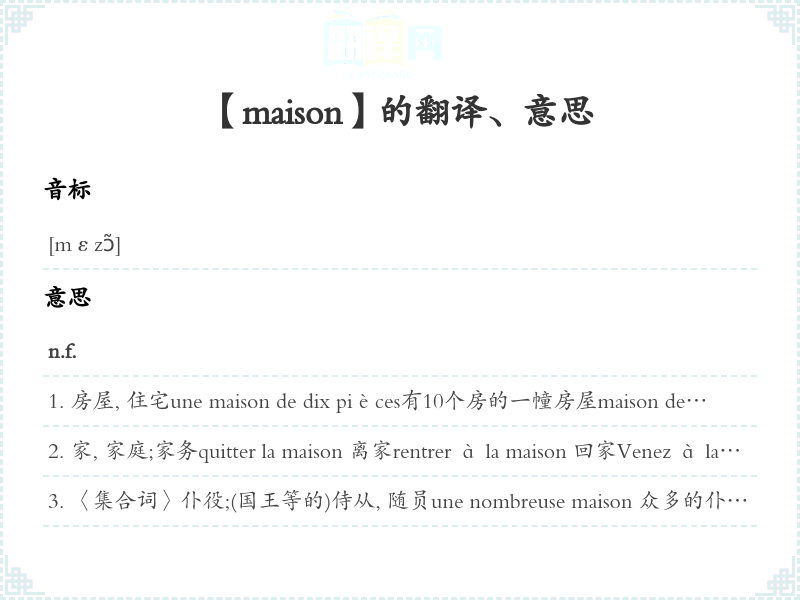 院, 所, 馆maison de convalescence疗养所les Petites-Maison s(巴黎的)精神病院maison de la culture文化馆maison d'éducation学校;寄宿学校maison de retraite养老院maison de santé精神病院maison du soldat军人招待所maison de jeux赌场maison close, maison de tolérance妓院