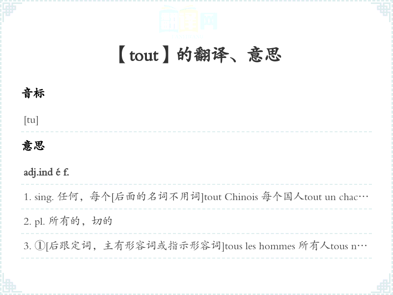 sing. 任何,每个[后面的名词不用词]tout Chinois 每个国人tout un chacun 每个人à tout âge 在任何年纪avant/ sur toute chose 首先en tout état de cause 在任何情况下