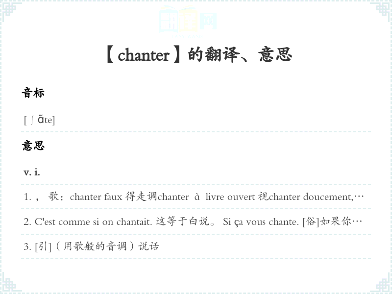 【chanter】 助记:、 词根:、 派生:、 名词化:、 形容词化:、 近义词:、 反义词: 联想词
