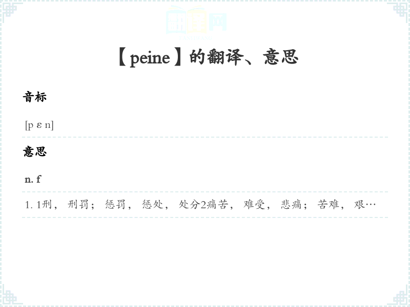 1刑, 刑罚; 惩罚, 惩处, 处分2痛苦, 难受, 悲痛; 苦难, 艰辛3担心, 不安, 忧虑4劳苦, 辛劳, 辛苦5困难, 障碍à~adv. [短语]1刚刚, 才; 几乎不, 勉强à peine guérie, elle a repris le travail. 她病刚好就又继续工作了。2困难, 费力à grand-~, à grand'~adv. [短语]非常困难, 勉强, 好不容易avec~adv. [短语]困难, 费, 吃力sans~adv. [短语]容易, 不费, 毫无困难sous~deprép. [短语]1者以…论处2否则就…, 有可能会…valoir la ~ de值得常见用法être la peine de有…… 法 语 助 手