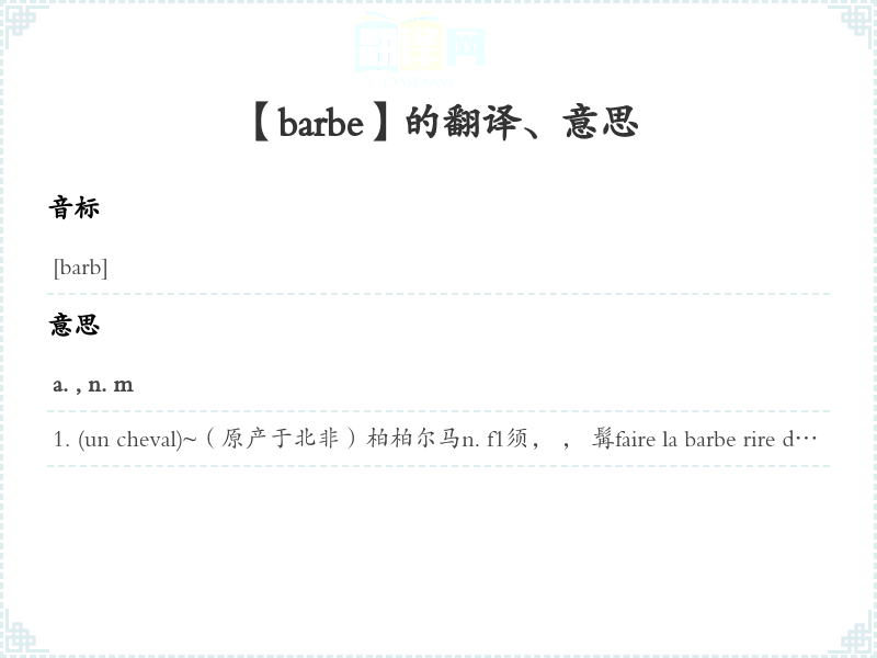 (un cheval)~(原产于北非)柏柏尔马n. f1须, , 髯faire la barbe rire dans sa barbe 窃笑,暗喜2<口>厌烦, 不耐烦la barbe ! quelle barbe ! 讨厌!够了!3<引>(某些动物)须; (鲽等扁形鱼类)鳍刺4(大麦等)芒, 芒刺5(鸟类)羽支6 pl. (金属板切割后或纸张裁开后边上)须<俗>令人讨厌事俗>引>口>c'est vraiment la barbe de faire la vaisselle