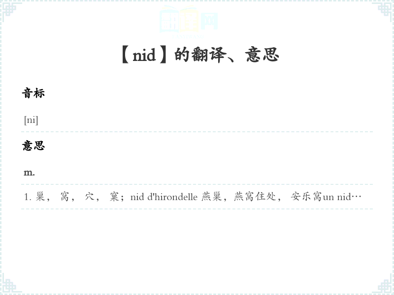 巢, 窝, 穴, 窠;nid d'hirondelle 燕巢,燕窝住处, 安乐窝un nid d'amoureux 爱巢un nid douillet 安乐窝