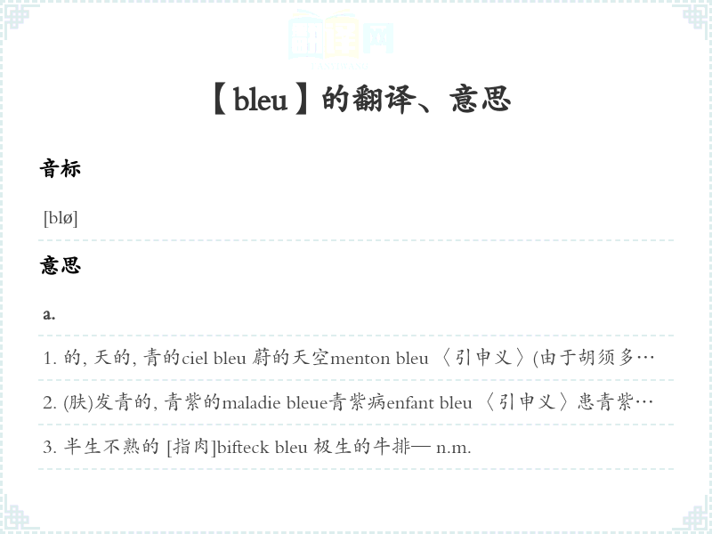 的, 天的, 青的ciel bleu 蔚的天空menton bleu 〈引申义〉(由于胡须多而硬)剃得发青的下巴颏conte bleu 〈转义〉〈旧语,旧义〉海外奇谈, 瞎扯的故事cordon bleu 〈转义〉高明的女厨师sang bleu 〈转义〉贵族出身le métal bleu 钴zone bleue地区 [指法国大城市内白天停车不得超过小时的地区]