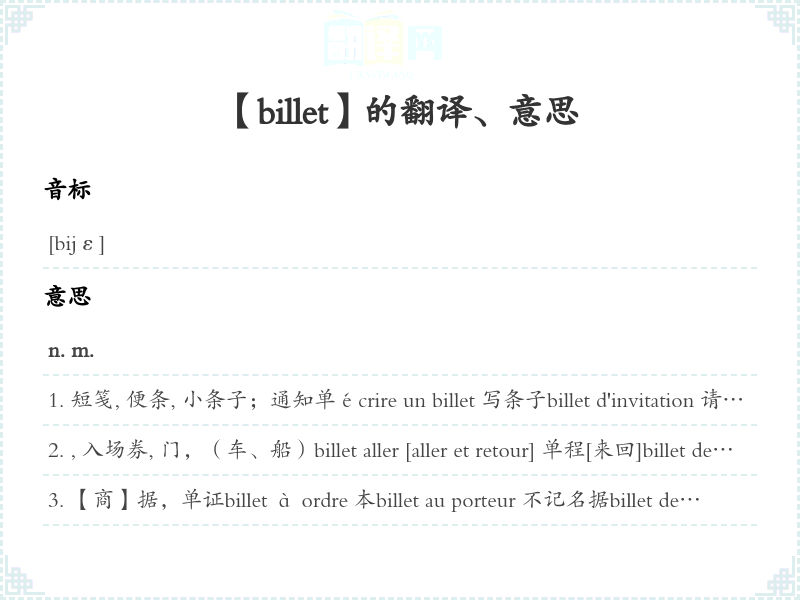 【billet】 联想:、 名词变化:、 动词变化:、 近义词: 联想词