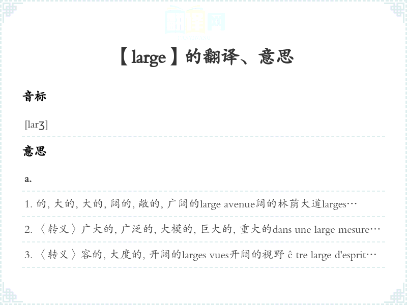 〈转义〉从地, 粗略地, 地calculer large 打得, 算得voir large 看得开au largeloc.adv.敞地, 绰地être logé au large 住得绰, 〈转义〉日子过得au long et au largeloc.adv.向四面八方, 向四周围s'étendre au long et au large 向四面八方展开en long et en large , de long en largeloc.adv.纵横地se promener en long et en large [de long en large ]踱来踱去〈转义〉〈口语〉翻来覆去;用各种方式expliquer une chose en long et en large 用各种方式解释一件事