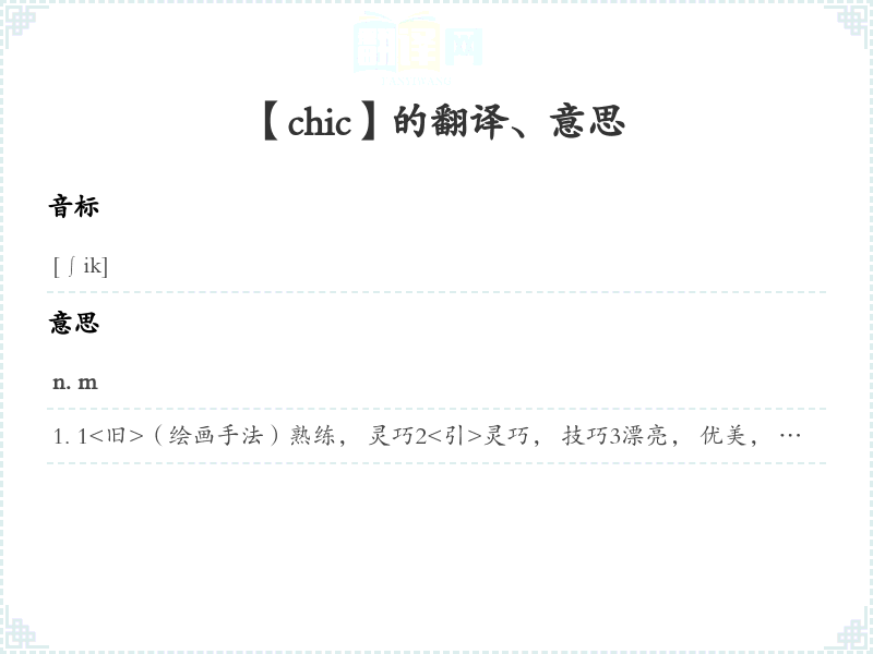 1<旧>(绘画手法)熟练, 灵巧2<引>灵巧, 技巧3漂亮, 优美, 雅致, 别致, 潇洒avoir du chic 很漂亮,很潇洒manquer de chic 不雅致4欢呼, 喝彩, 鼓掌[学生语]引>旧>adj. inv.1漂亮的, 雅致的, 别致的, 潇洒的2<口>美好的3<口>慷慨的, 大方的, 热心的口>口>interj.<口>太美了!太好了!口>de~adv. [短语]<旧>不加准备地, 即兴地旧>il exécutait ses œuvres de chic (Daudet)他总是胸有成竹地完成自己的作品(都德)