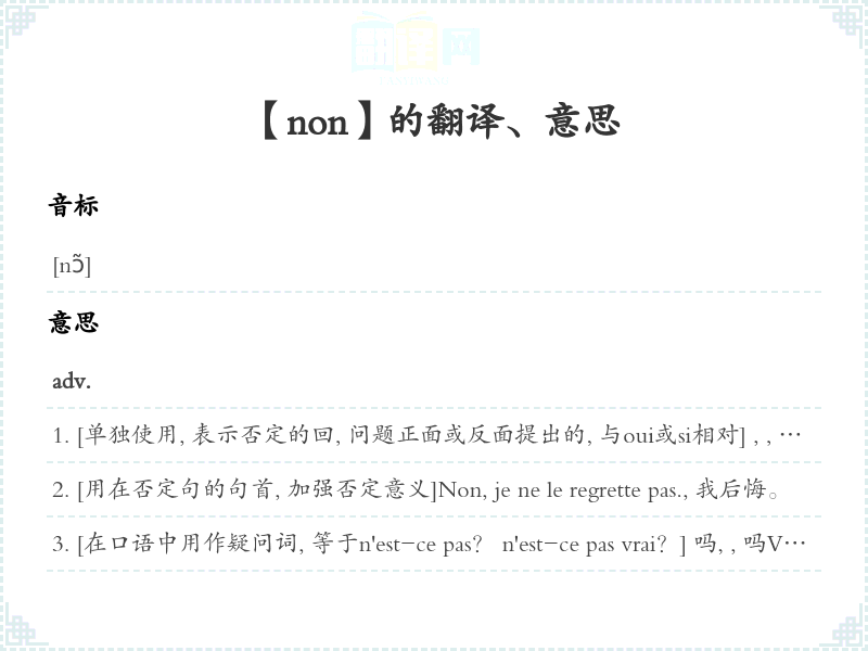 loc.adv.也, 同样Tu n'attends pas? Moi non plus.你等了吗?我也等了。non (pas) queloc.conj.并非, 并因为 [后接subj.]Il aimait ce quartier de Paris, non pas qu'il fût beau, mais parce qu'il était tranquille.他喜欢巴黎的这一区, 并因为这一区美丽, 而因为这一区安静。non (pas)..., mais...loc.adv.…而…Écrivez ceci non pas de gauche à droite mais de haut en bas.这要从左到右写, 而要从上到下写。non sansloc.prép.并非没有, 无non sans peine并费力的non sans hésitation无犹豫地non seulementloc.adv.仅, 但 [与连接词或连接词词组mais, mais encore, mais aussi, mais même(而且…, 还…)并用]Non seulement il a tort, mais encore s'obstine.他仅错了, 而且还坚持。