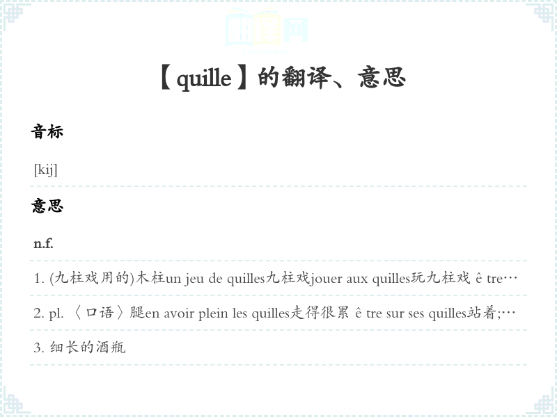 (九柱戏用的)木柱un jeu de quilles九柱戏jouer aux quilles玩九柱戏être planté là comme une quille 像木头人一样站着être reçu comme un chien dans un jeu de quilles〈口语〉遭到冷遇