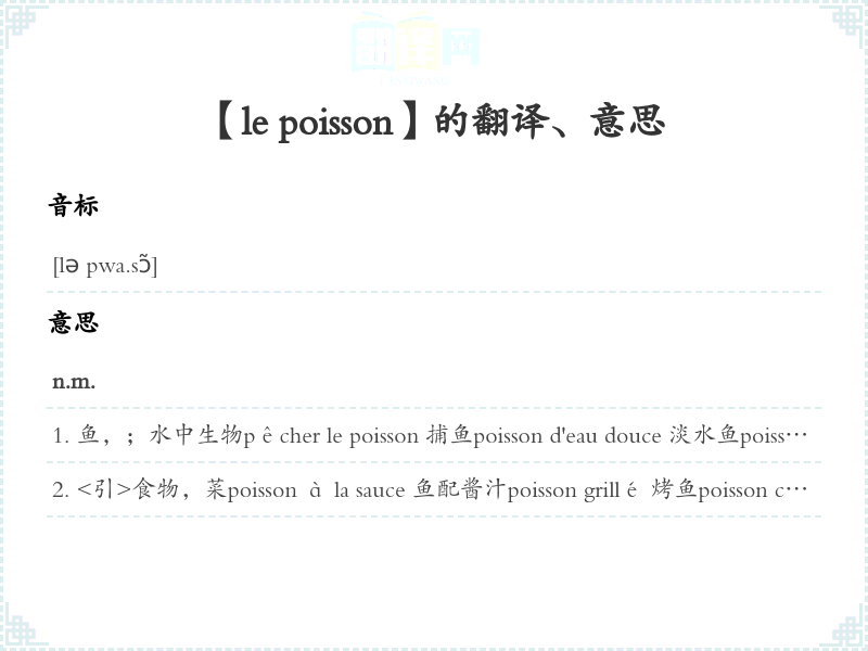 【le poisson】 助记:、 词根:、 联想、 名词化:、 词化:、 形容词化:、 近义词、 反义词、 同音、近音词 联想词