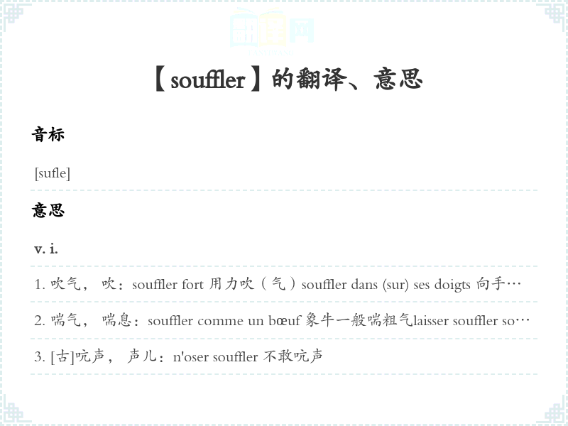 (风)吹, 刮:Le vent souffle. 刮着风。 regarder d'où (de quel côté) souffle le vent [转]观察风向, 观察事态变化[用作v. impers. ] Il soufflait une petite brise matinale 吹着轻风。v. t.