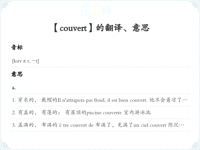 (供一人使用的)一副餐具couvert d'argent 银餐具une table de douze couverts 摆12副餐具的餐桌lave-vaisselle de douze couverts 一打餐具容量的洗碟机retenir deux couverts au restaurant 在饭店预订两个座avoir toujours son couvert mis chez qn 是家餐桌上的常客 [家关系亲]à couvert deprép. [短语]在避开…的地方à couvertadv. [短语]在掩处; <转>在安全处, 有保障转>sous le couvert deprép. [短语]在…承担责任的情况下, 在…担保下; 在…名义下sous couvert deprép. [短语]由(人)转[用于通讯地址]