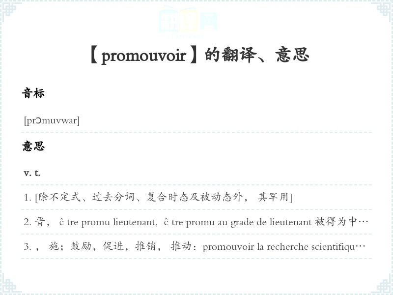 【promouvoir】 派生:、 近义词:、 反义词: 联想词
