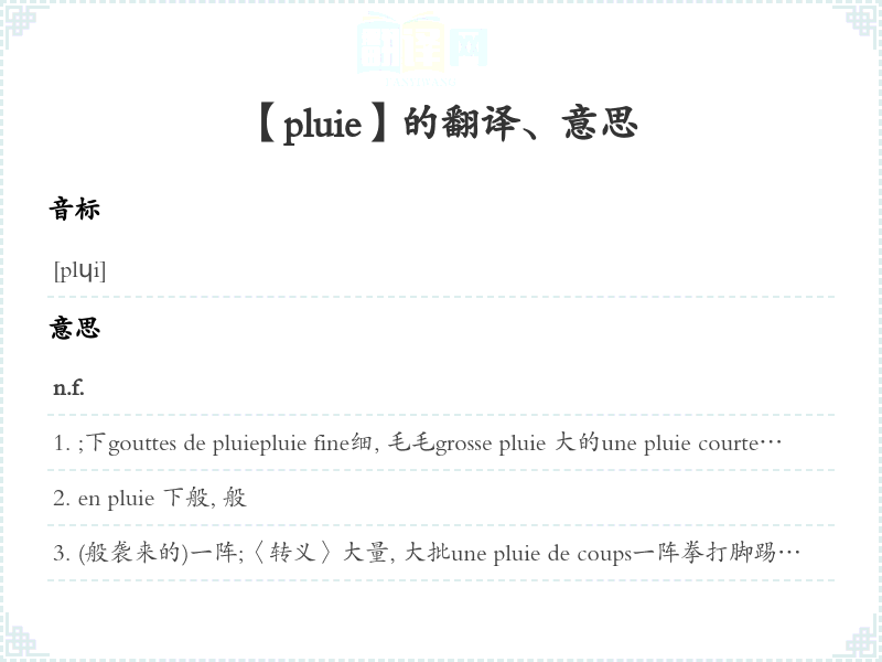 【pluie】 联想:、 动词变化:、 近义词:、 反义词: 联想词