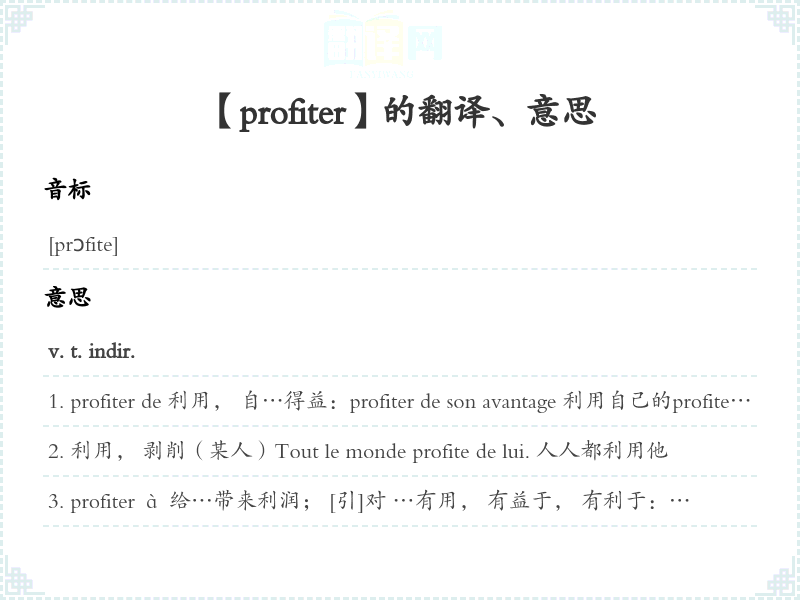 profiter de 利用, 自…得益:profiter de son avantage 利用自己的profiter d'un livre 一本书中得益profiter d'une (de l') occasion 抓住机会, 乘机profiter de qch pour …借口某事 …, 趁某个机会 …profiter de ce que 利用…, 趁 … :Il profita de ce que tout le monde dormait encore pour s'esquiver. 他趁大家都还在睡觉的时候偷偷走了。 Nous avons beaucoup profité des expériences d'autrui. 我们他人的经验中得益不浅。