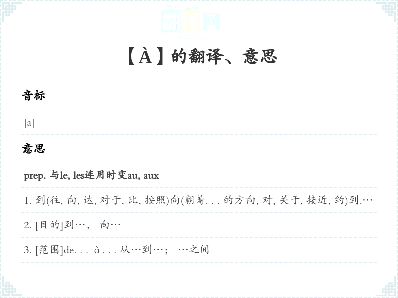 [点]在…travailler aux champs 在田里干活blessé au bras 手臂受伤au bord de la rivière 在河边[城市、乡村名前一般用à,中国省名前用à+定冠词,阳性国名前用à+定冠词,复数国名前用aux]être à Shanghai 在上海;à Paris 在巴黎;au Sichuan 在四川省;au Japon 在日本;aux États-Unis 在美国