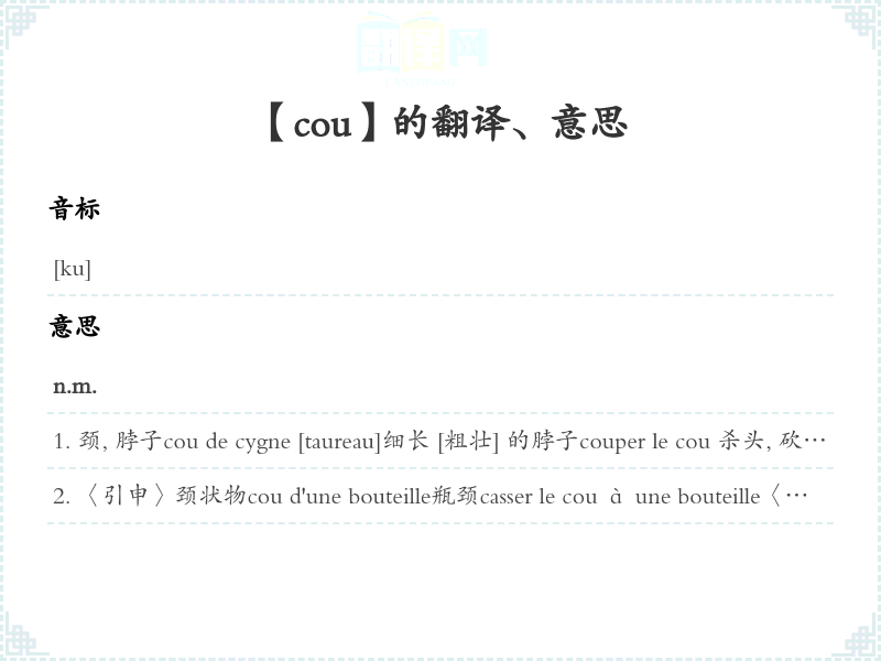 颈, 脖子cou de cygne [taureau]细长 [粗壮] 的脖子couper le cou 杀头, 砍头tendre le cou 引颈就戮jusqu'au cou 〈转〉完全地, 整个地prendre ses jambes à son cou 跨大步跑;拔腿就跑mettre à qn la corde au cou 给某人套上绞索laisser [mettre] la bride sur le cou 放松马缰绳;〈转〉任其自由行动sauter au cou de qn扑上搂住某人, 热烈地拥抱某人se casser [se rompre] le cou 摔断颈骨, 摔死;〈转〉优势