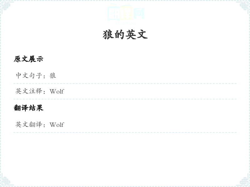 - 在翻译过程中,我们将中文词汇‘狼’直接翻译为英文‘Wolf’,因为这是一个特指的动物名称,不需要进一步的解释或转换。
