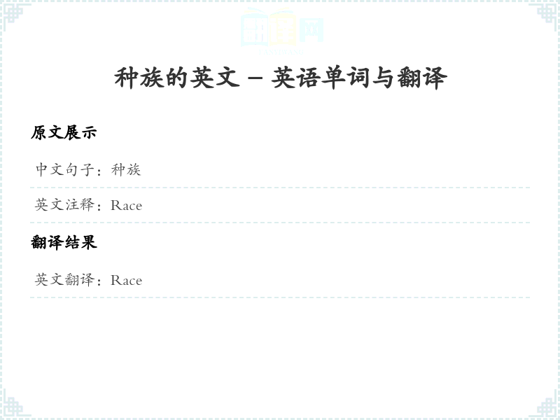 - 对于“种族”这个词的翻译,我们直接使用了“Race”,因为它是最常用的对应词,涵盖了人类社会中对不同人群的分类。