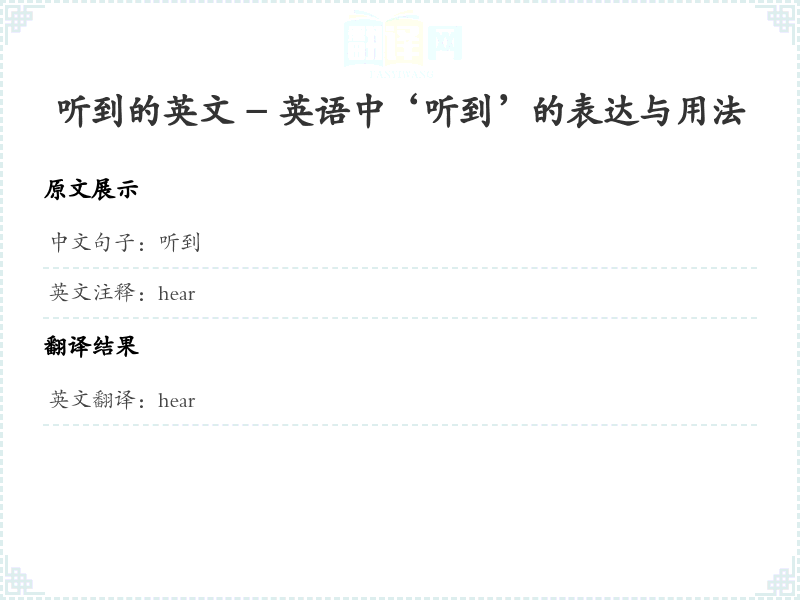 通过本篇文章的学习,希望你能够对"听到"这个词的翻译及相关用法有一个全面的理解,并在实际应用中灵活运用。