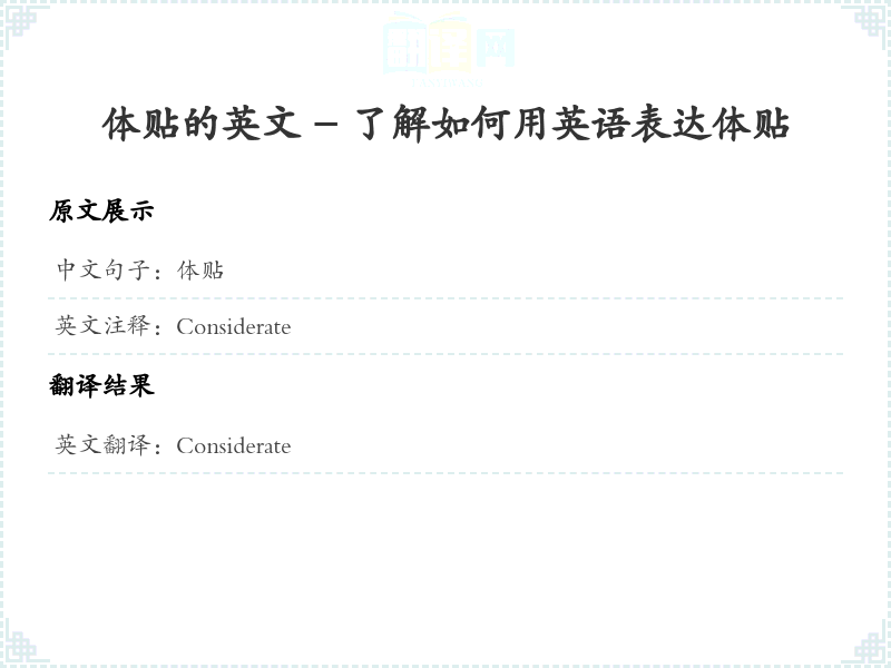 - 在翻译'体贴'时,考虑到该词的情感和社会语境,使用'Considerate'来传达一种关心他人感受的态度。