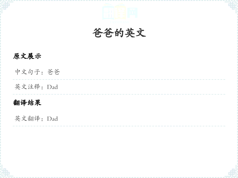 - 在翻译过程中,'爸爸'直接对应于英语中的'Dad',这是一个常用的家庭称谓,表示父亲。