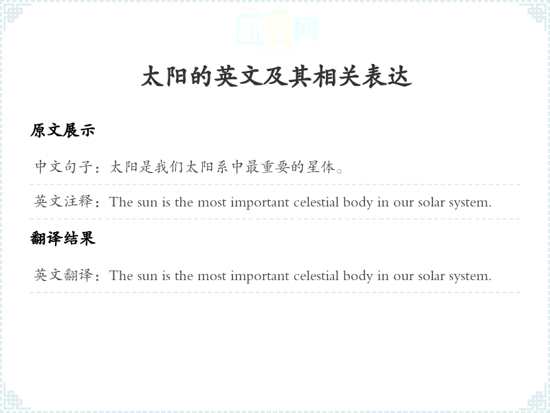 通过本篇文章的学习,希望你能够对"太阳是我们太阳系中最重要的星体。"这个词的翻译及相关用法有一个全面的理解,并在实际应用中灵活运用。
