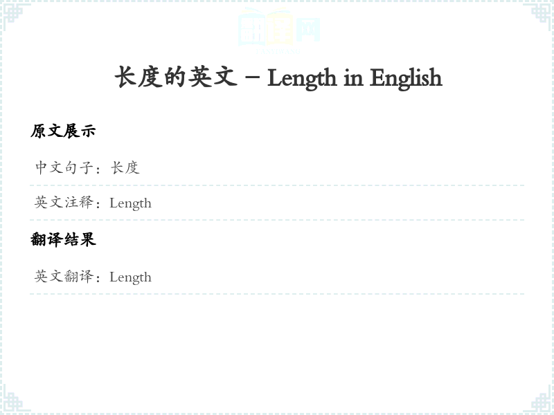 - 在翻译过程中,'长度'被直接翻译为'Length',因为这是该词在物理及数学领域的标准用法。