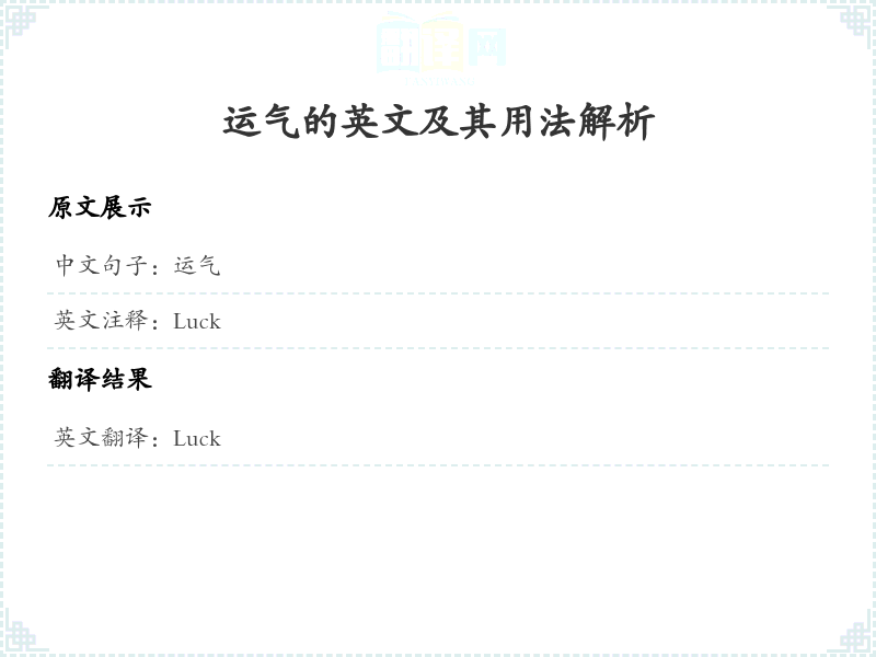 - 在翻译过程中,'运气'直接翻译为'Luck',这是一个常见的名词,表示一种偶然的好运或坏运气。