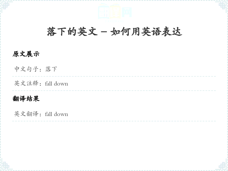 通过本篇文章的学习,希望你能够对"落下"这个词的翻译及相关用法有一个全面的理解,并在实际应用中灵活运用。