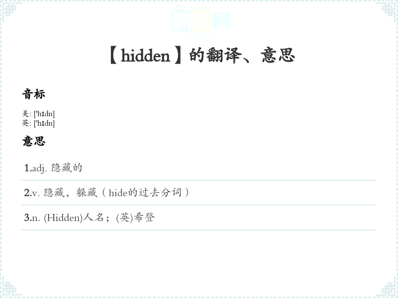 - “hidden”来自古英语“hidde”,意为“隐藏的”,其词根是“hide”(隐藏),后缀“-en”常用于形成形容词。