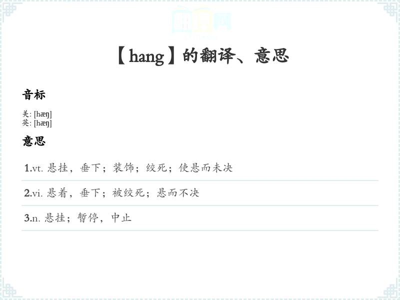 3.n. 悬挂;暂停,中止 4.n. (Hang)人名;(罗)汉格;(东南亚国家华语)康;(老)汉;(柬)韩(用于名字第一节),杭