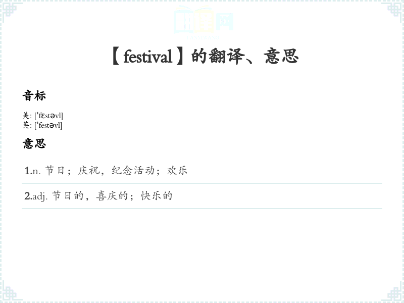- 字面意思:Festival 是指庆祝特定或季节的活动,通常包括娱乐、食物和社交。定义为“一个特定的时间段,通常是庆祝某种或传统的活动,通常包括音乐、舞蹈、食物和其他娱乐形式”。