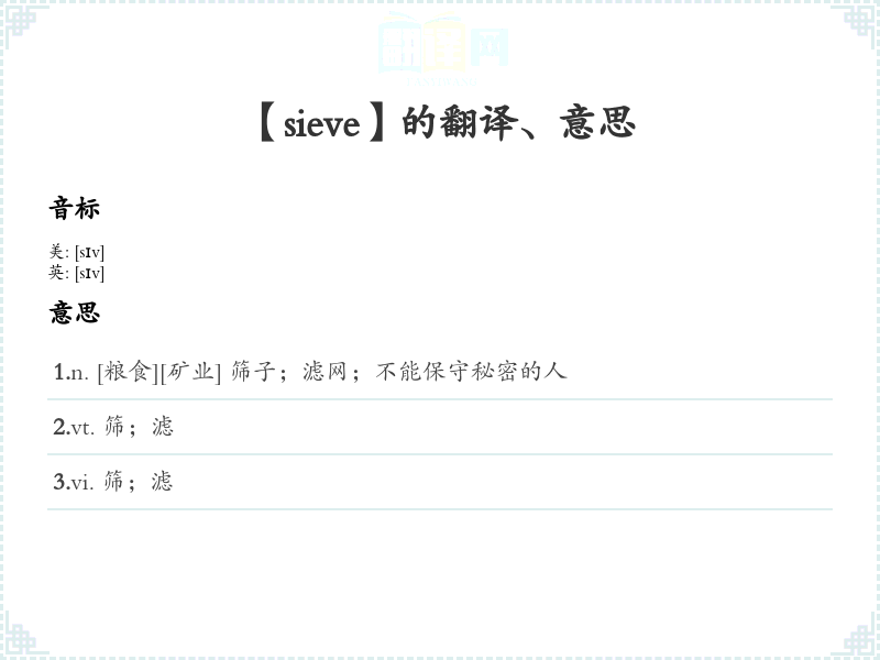 - 常见搭配词汇:fine sieve(细筛),metal sieve(金属筛),sieve out(筛选出),sieve through(过滤),sieve for(筛查)。