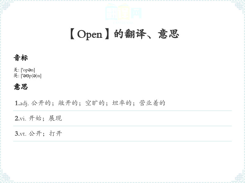 1.adj. 公开的;敞开的;空旷的;坦率的;营业着的