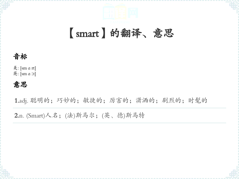1.adj. 聪明的;巧妙的;敏捷的;厉害的;潇洒的;剧烈的;时髦的 2.n. (Smart)人名;(法)斯马尔;(英、德)斯马特