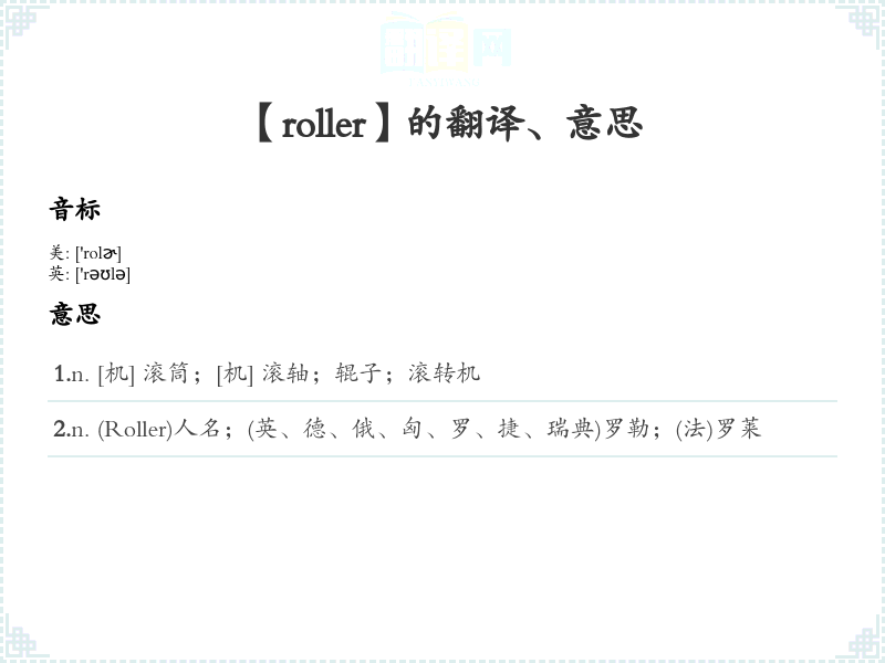 1.n. [机] 滚筒;[机] 滚轴;辊子;滚转机 2.n. (Roller)人名;(英、德、俄、匈、罗、捷、瑞典)罗勒;(法)罗莱