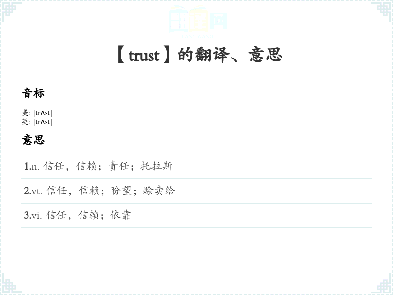 3.vi. 信任,信赖;依靠 4.n. (Trust)人名;(英)特拉斯特