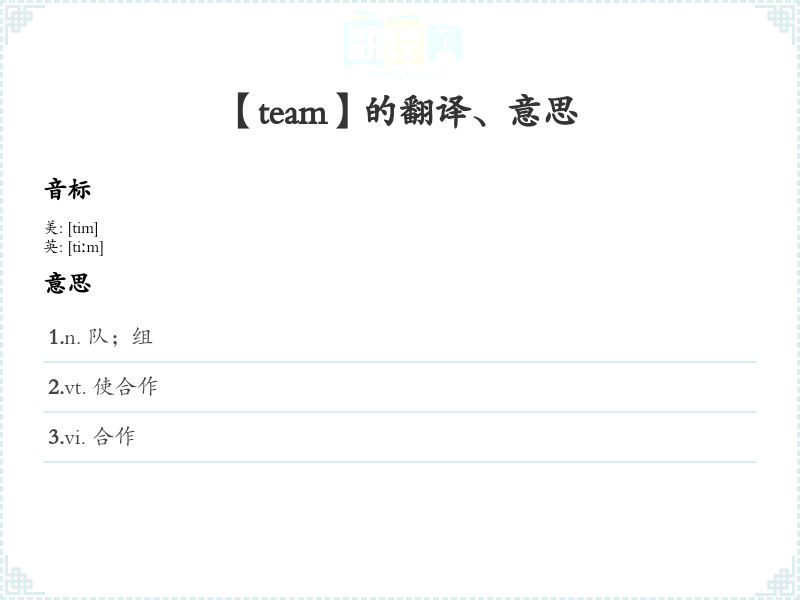 3.vi. 合作 4.n. (Team)人名;(柬)甸