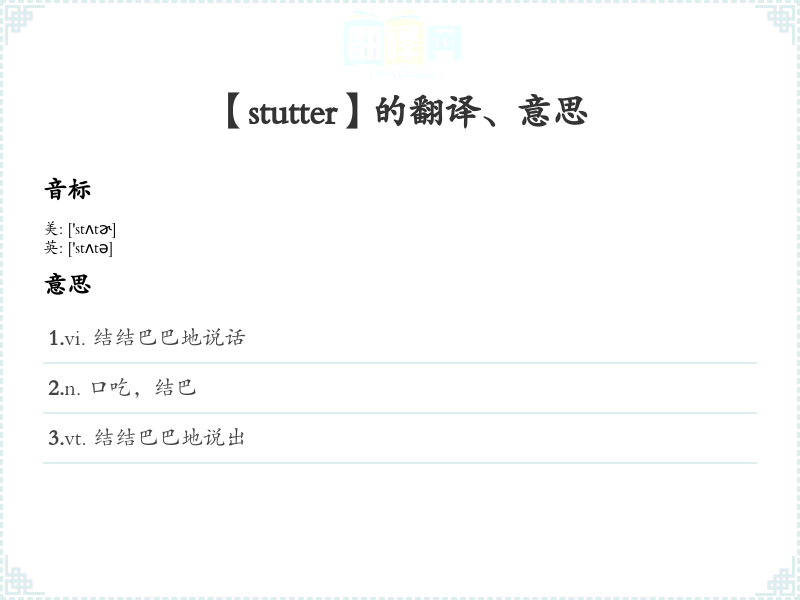 - 字面意思:stutter(口吃)是指说话时出现重复或延迟的现象,通常表现为发音不流畅。