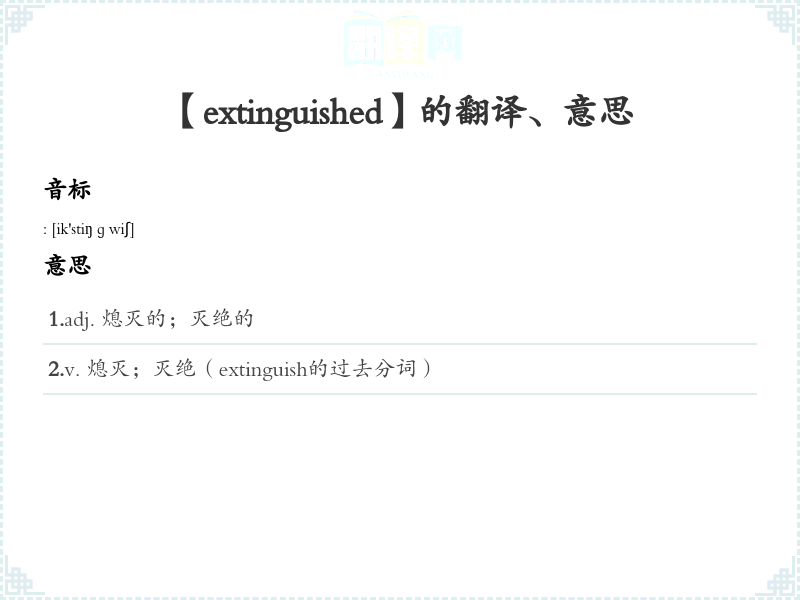1.adj. 熄灭的;灭绝的 2.v. 熄灭;灭绝(extinguish的过去分词)