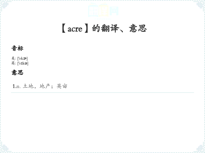 - 字面意思:Acre 是一个土地面积的单位,等于约404.8平方米或0.4048公顷。它常用于描述土地的面积,尤其是在农业和房地产领域。