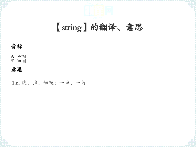 - 1. [N-VAR] String is thin rope made of twisted threads, used for tying things together or tying up packages. 细绳