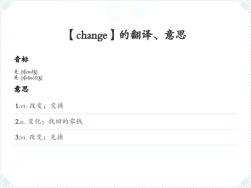 2.n. 变化;找回的零钱 3.vi. 改变;兑换