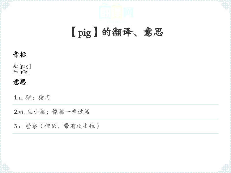 - 定义:Pig (名词) 是一种哺乳动物,属于猪科,通常被人类饲养用于肉食,其肉称为猪肉。此外,“pig”也可以用作人们的贬义词,指那些贪婪或肮脏的人。