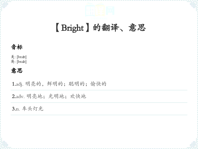- 字面意思:Bright 的字面含义是“发光的”或“明亮的”,通常用于描述光线、颜色或某种事物的清晰度。